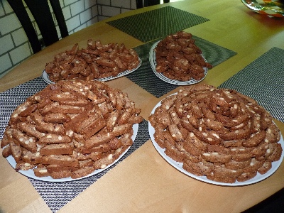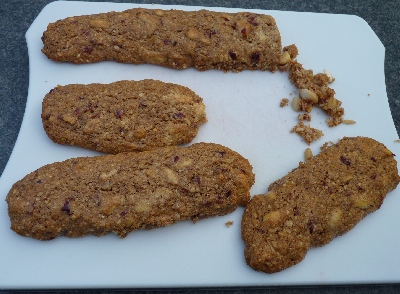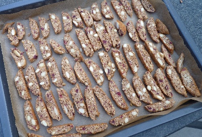 Alle Zutaten miteinander vermischen. Im Kühlschrank lässt man den Teig über Nacht abgedeckt auskühlen. Den Teig zu dünnen Rollen formen, auf einem Blech bei ca. 170 ° C 25 Minuten zum ersten Mal abbbacken. Die Teigrollen verlieren ihre Form, flachen ab. Man schneidet nach dem Erkalten (ca. 2 Stunden) mit einem scharfen Messer Streifen von ca. 12 mm ab und bäckt diese bei 130 ° C nochmals ca. 35 Minuten bei Umluftbetrieb.