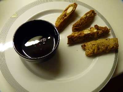 Die zwiebackartigen Cantuccini kann man mit Vin Santo, Sherry, anderem Likörwein oder auch Fruchstsirup, Marmelade, Kaffee ... zum Tunken anbieten. Mir schmecken sie auch pur sehr gut.